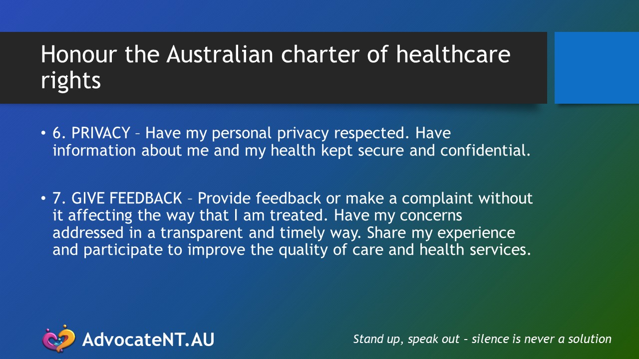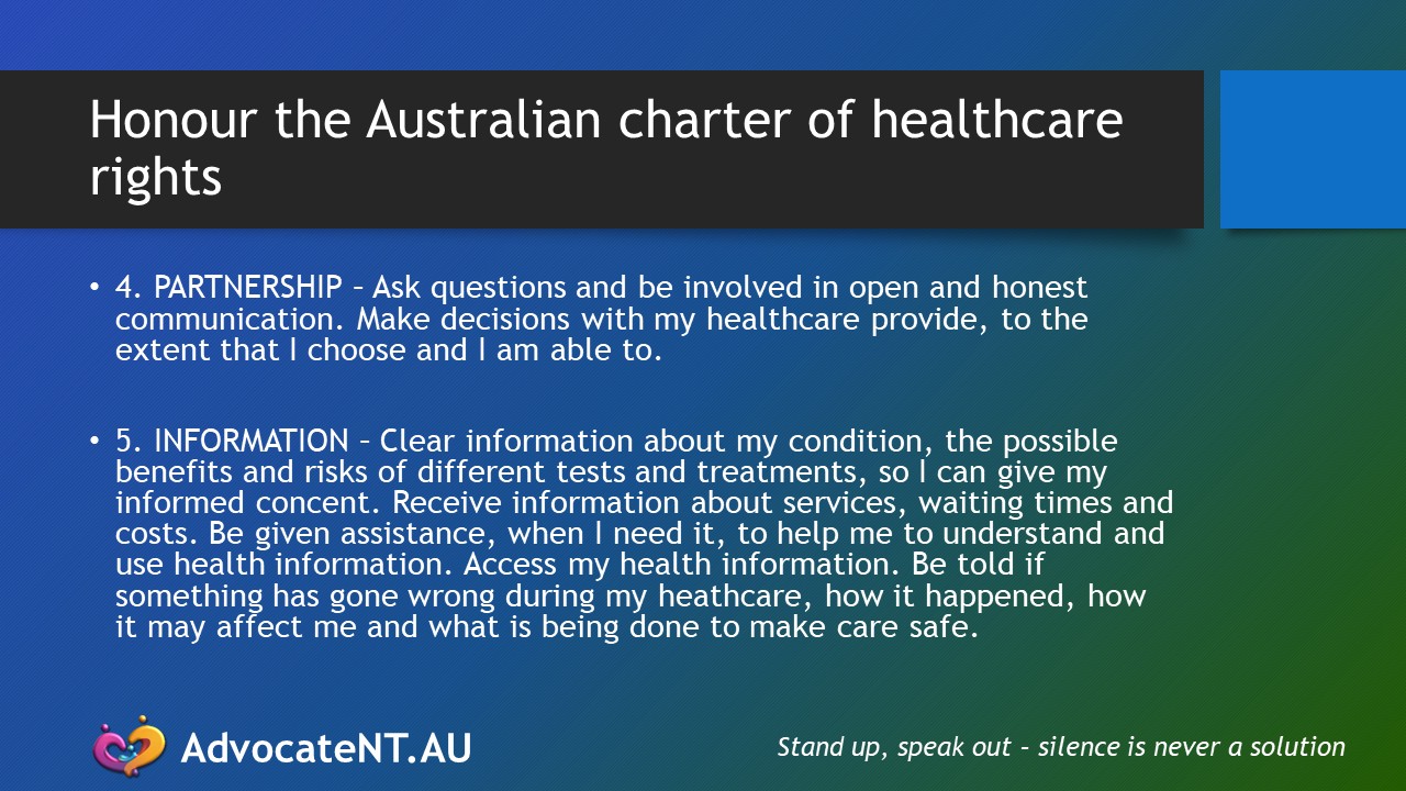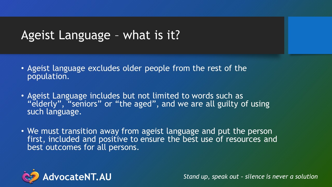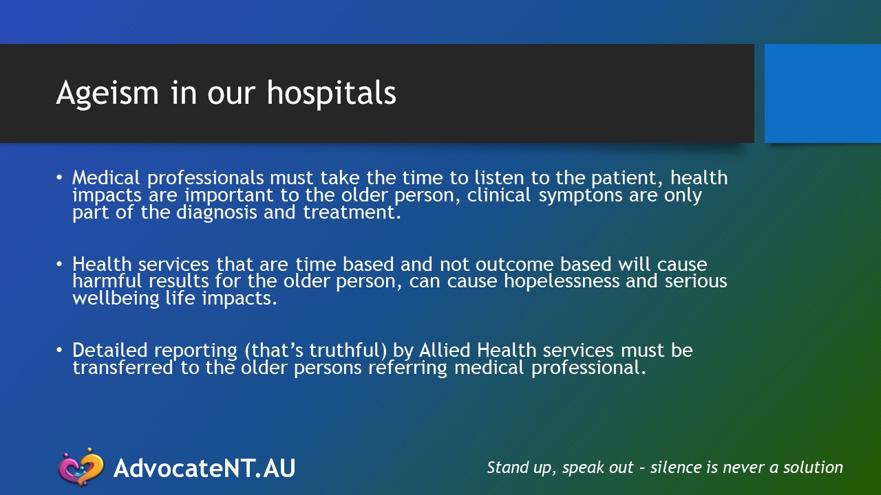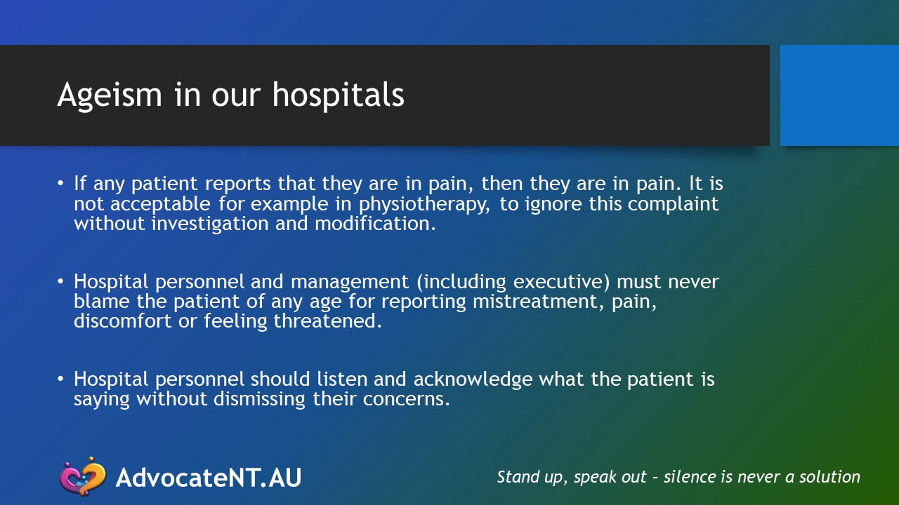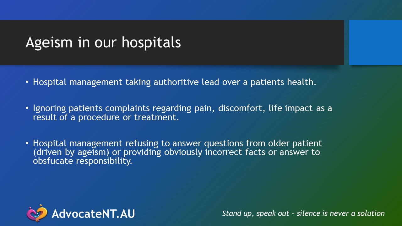- Suggestions that you are too old for medical treatment, Ageist assumptions;